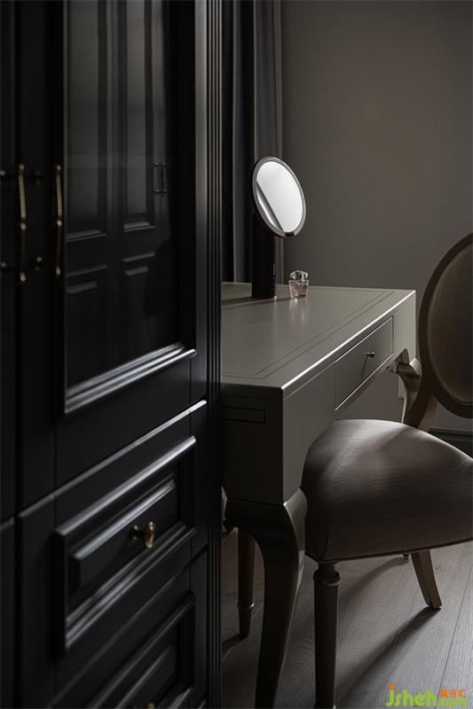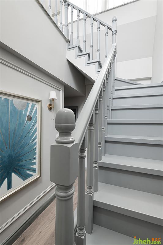 樓梯整體采用高級灰打底,墻面印象派畫作用以跳色,灰與藍(lán)的搭配充滿戲劇效果,一抹藍(lán)色躍然而出。線條在此空間被運用的淋漓盡致,墻面石膏線條、實木踢腳線、實木門框線、樓梯羅馬柱線條,每一個細(xì)節(jié)的處理與點綴,都是設(shè)計者對風(fēng)格整體把控能力展現(xiàn)。