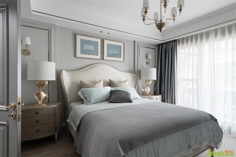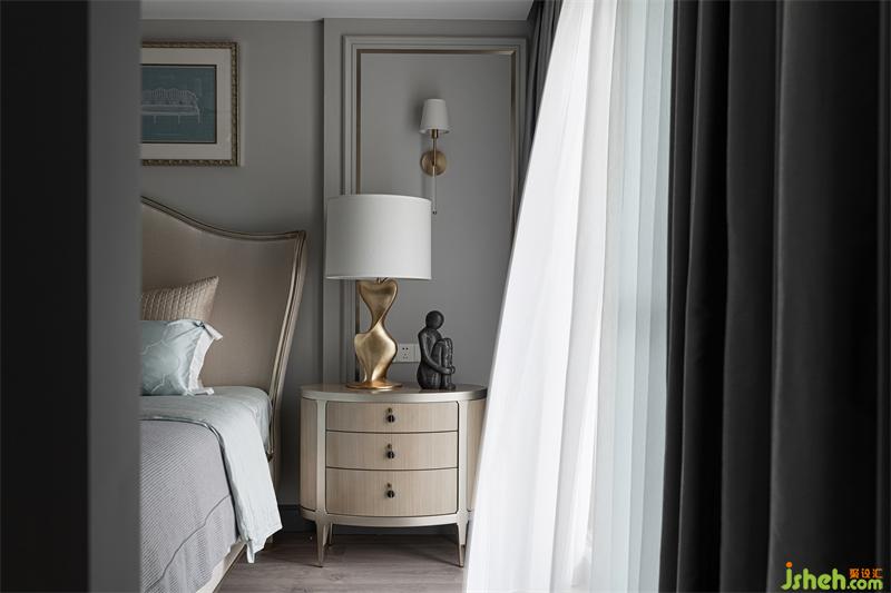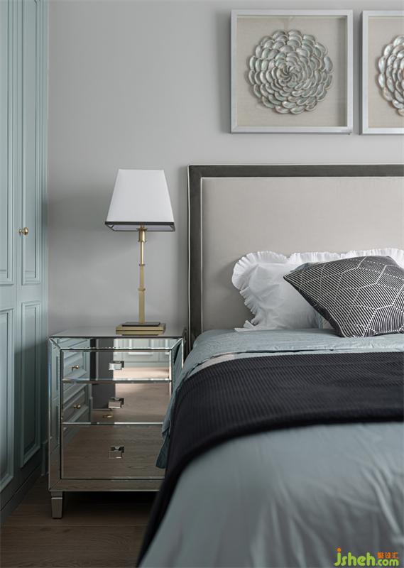 三樓為屋主夫妻兩的主臥,暖灰、蒼藍(lán)、蜂蜜色三色為空間主色調(diào)。蒼藍(lán)色被大面積的用到了空間各處呈現(xiàn)出一種溫柔情緒,如身處藍(lán)天白云微風(fēng)拂面的海邊。