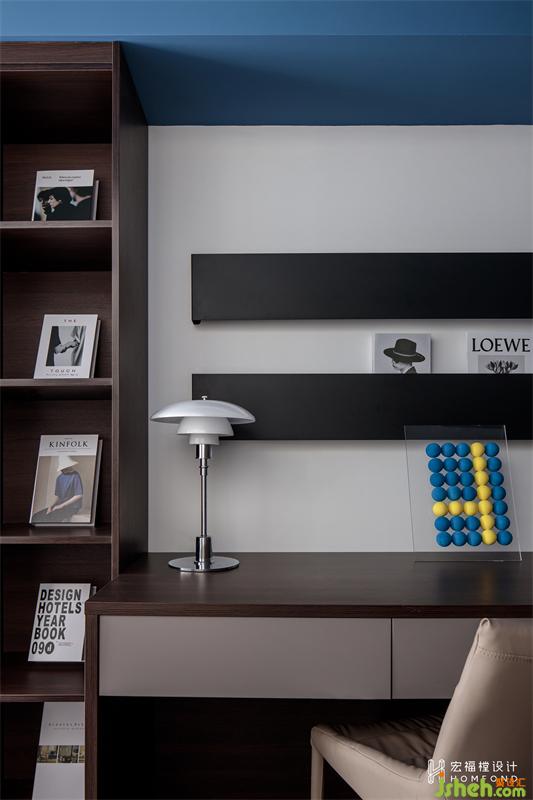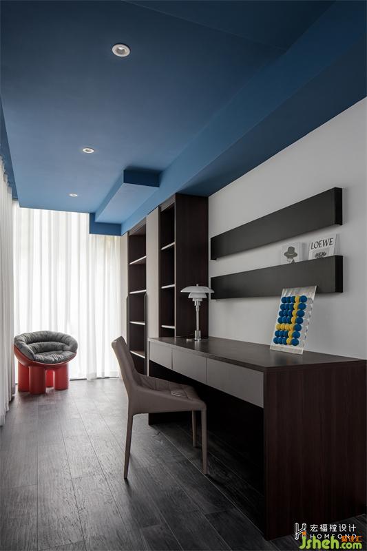 書房空間進(jìn)行搭建后,將整體面積從10m2 擴(kuò)大為20.4m2 ,L型兩面落地窗讓空間清透明亮。頂部涂成代爾夫特藍(lán),在視覺上弱化了搭建部分的異形梁體。