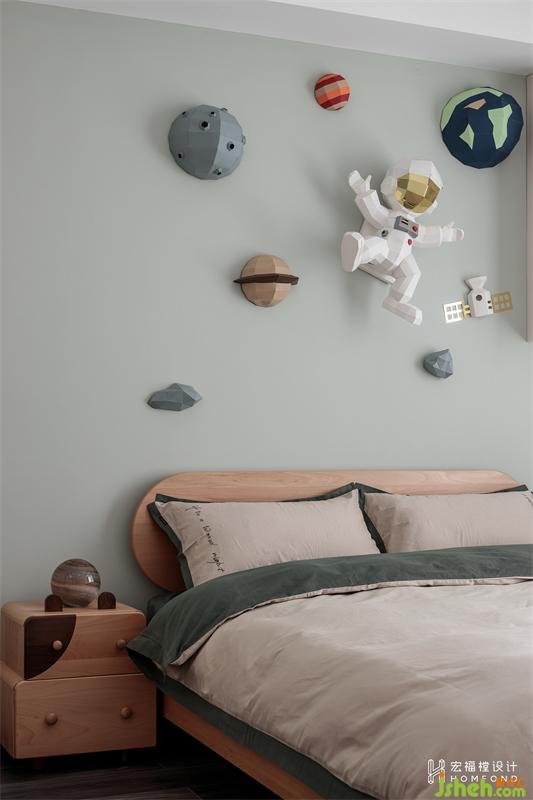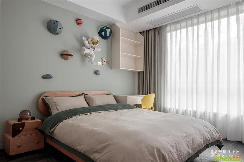 弟弟今年5歲,對于低年齡階段的兒童而言,綿軟輕薄、透氣舒適的氛圍可以給他們帶來安全感。所以房間用溫柔的豆蔻青作為主色調(diào),墻上粘貼的是女屋主手作的3D太空貼紙,讓孩子小小的世界可以擁有天馬行空的奇妙幻想。