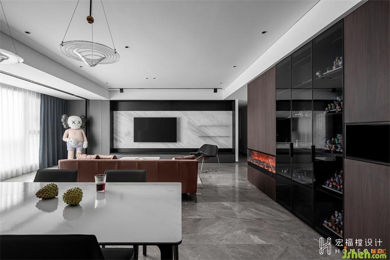 進(jìn)門視野開闊,布局充滿趣味性和開放性。首先玄關(guān)設(shè)計為裝飾性與儲存功能一體的5060mmx1600mmL型柜體,給屋主喜愛的手辦分別安了家。然后1800mm高的kaws玩偶作為空間點(diǎn)晴裝飾,打破現(xiàn)代風(fēng)格帶來的過于硬朗感,讓氣氛蘊(yùn)藏活力,童真大概就是讓人長生不老的靈丹妙藥。