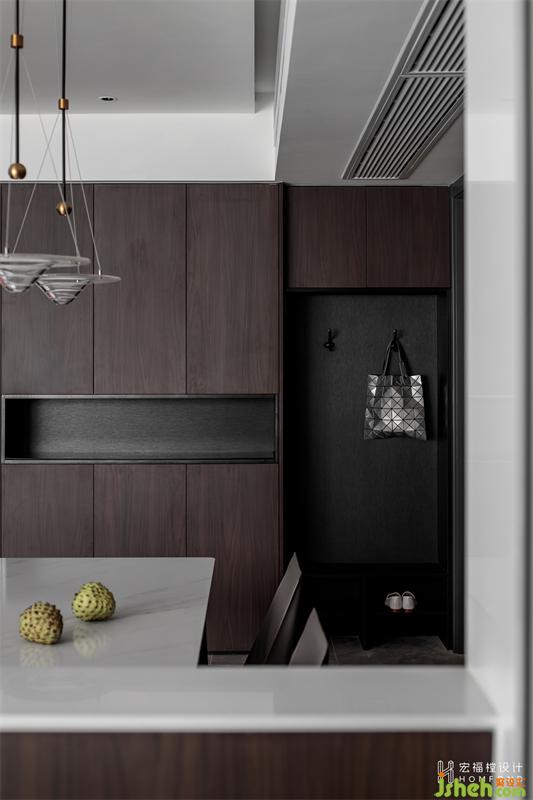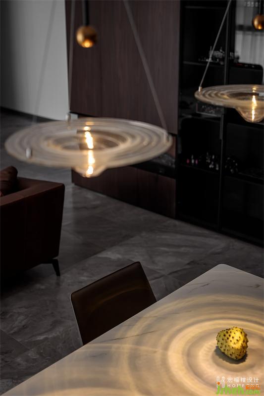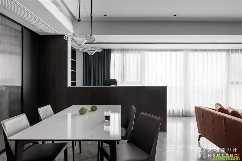 魚線型玻璃吊燈,光影曼妙靈動,讓餐廳呈現(xiàn)影影綽綽的朦朧之美。緊挨餐廳陽臺區(qū)域我們設(shè)計為2400mmx600mm的半隔斷游戲區(qū)域,左側(cè)利用墻體遮擋處設(shè)計1550mm書柜,寬闊的空間不僅能兩人同時play the game,并且可與客廳、餐廳保持視野的流暢溝通。