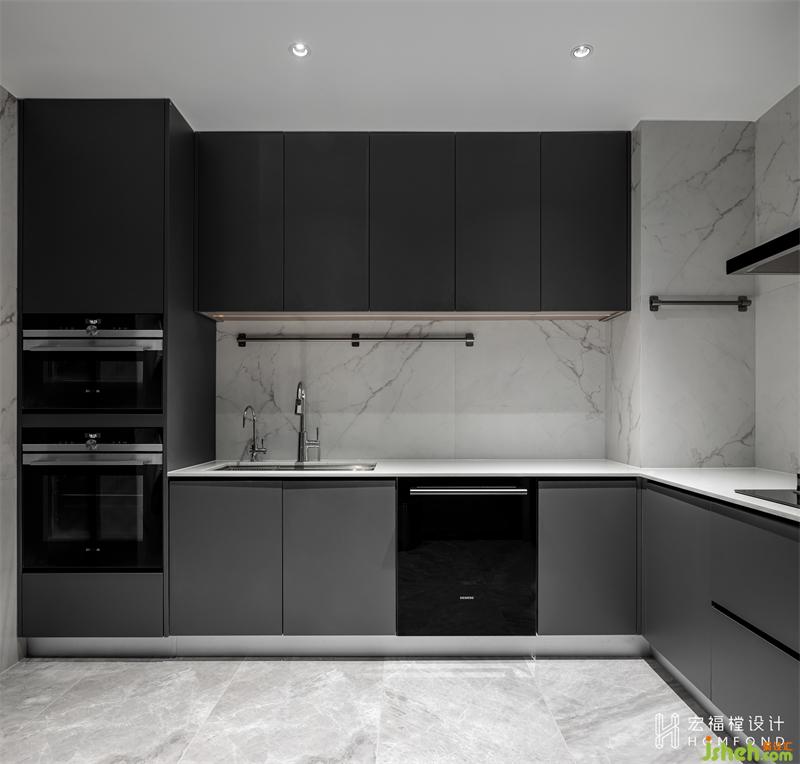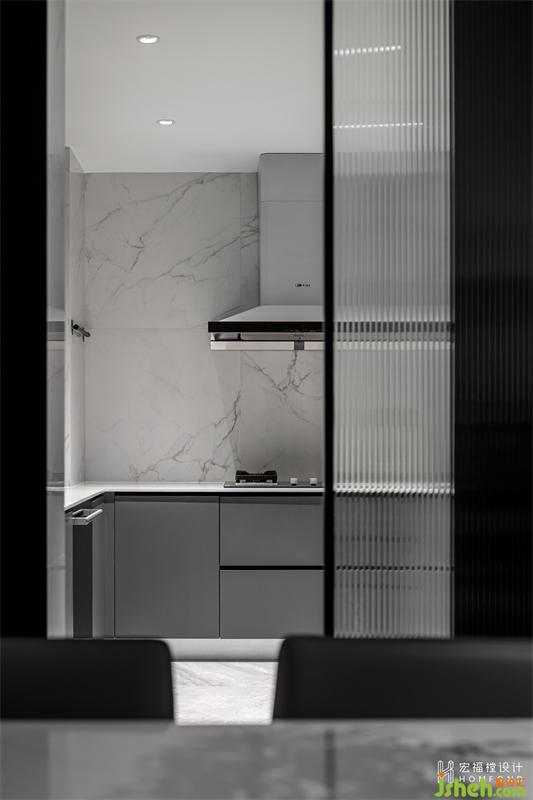 因為屋主平日的飲食習(xí)慣會產(chǎn)生大量油煙,所以不宜將廚房全開放。但考慮到各個空間的流通性,所以我們使用長虹玻璃材質(zhì)的推拉門,這樣讓空間獨(dú)立的同時也有通透之感。