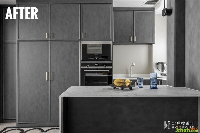 原始玄關(guān)為酒柜+吧臺,顏色深沉,完全與屋主生活習(xí)慣及氣質(zhì)不符。我們將其拆除后改造為3250mm+580mmL型儲物空間+西廚,再根據(jù)女屋主身高打造長1200mmx寬600mmx高880mm的島臺,方便她平日里為女兒烘焙蛋糕,準(zhǔn)備水果使用。島臺右側(cè)增添1980mmx380mm的鞋柜,滿足家人的鞋類放置。區(qū)域色彩改變?yōu)榛疑{(diào),通過材質(zhì)與紋理的變化營造優(yōu)雅而富有質(zhì)感的空間氛圍。