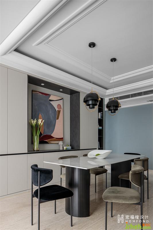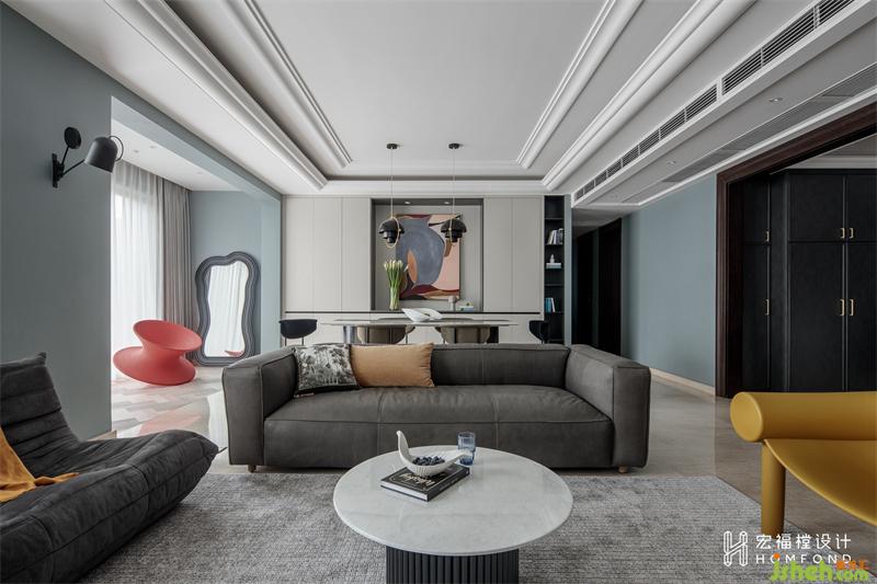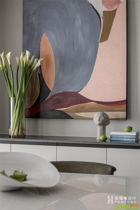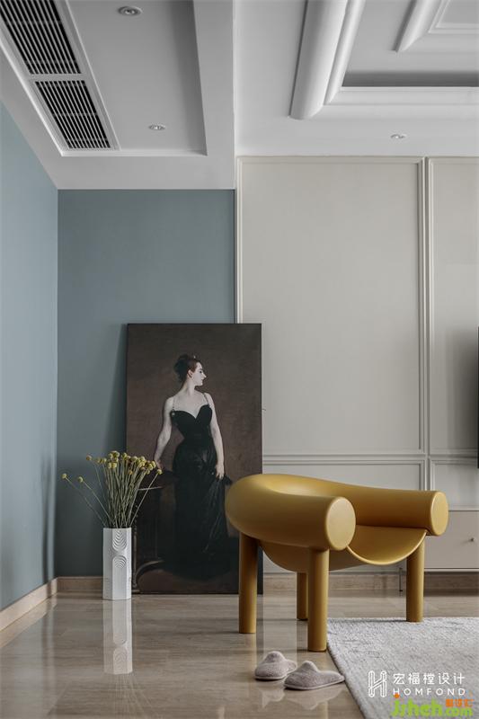 家居設(shè)計保留原始吊頂?shù)氖嗑€條及地面瓷磚,拆除電視墻,重刷乳膠漆,是將女屋主喜愛的灰、藍(lán)、綠進行中和后調(diào)配制成。陽臺納入客廳區(qū)域,增加空間亮度,讓精裝房在視覺上顯得更為清爽。輕快明媚的色彩及充滿藝術(shù)氣質(zhì)的掛畫、沙發(fā)、凳椅被拆分重新組合到空間中,表現(xiàn)出一種令人難以忽視的美感。