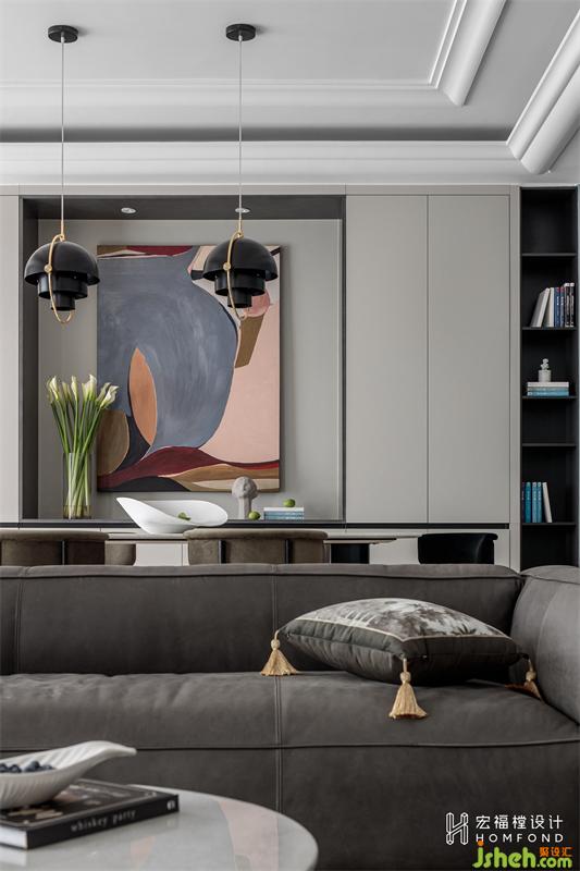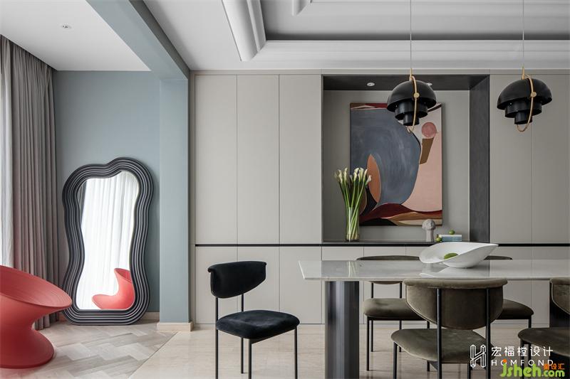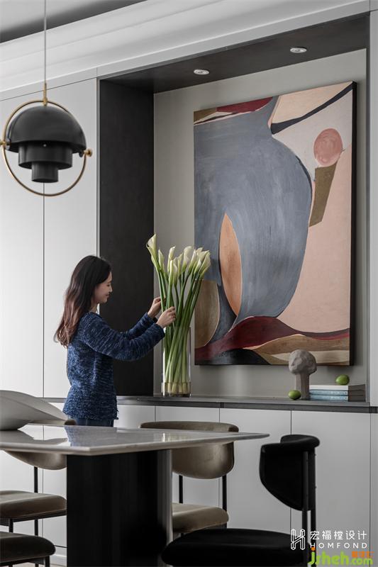 原始餐廳墻無裝飾設(shè)計,我們將其改為4190mmx400mm的餐邊柜,上下兩層,儲物空間充裕。曼妙感極強的抽象藝術(shù)油畫、女屋主精心打理的鮮花、極簡云石桌、現(xiàn)代翻轉(zhuǎn)圓球吊燈,空間氣氛通過巧妙安排相互協(xié)調(diào),營造出柔美而現(xiàn)代感極強的裝飾效果。