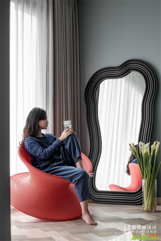 陽臺納入后與餐廳空間融合,運用客廳墻面的乳膠漆將其簡單的區(qū)分。胭脂紅陀螺椅子成為這個區(qū)域的點睛之筆,造型活潑,是夫妻為女兒和自己營造的生活趣味。