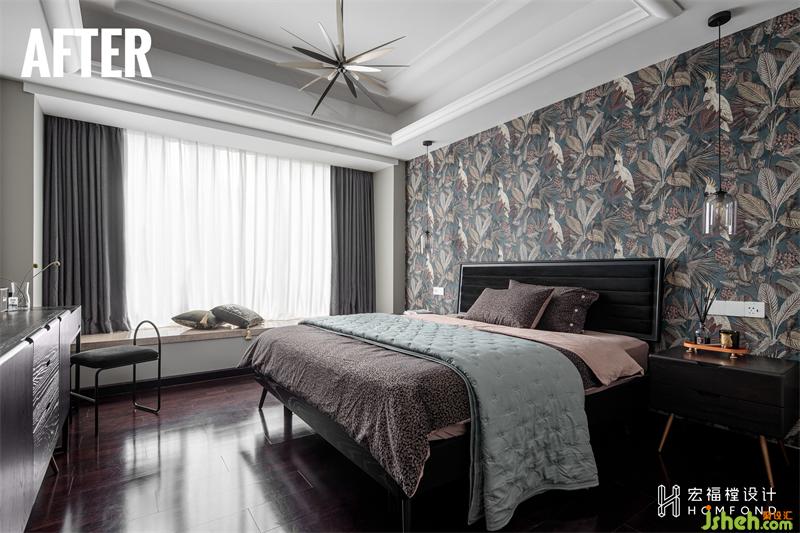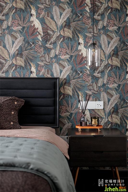 拆除原始主臥背景墻后整面鋪貼墻布,圖案以摩洛哥藍(lán)與溫柔米色相互交錯,復(fù)古而典雅的色調(diào)很好地把控著空間的氣氛與節(jié)奏,帶著幾分神秘與深沉,散發(fā)著寧靜安然的自然力量。