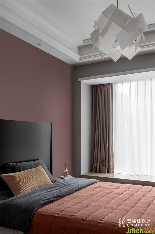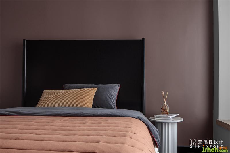 次臥是預(yù)留給父母偶爾探訪使用,整體色調(diào)以絳紫色呈現(xiàn),優(yōu)雅深邃的同時飽含浪漫的情韻。