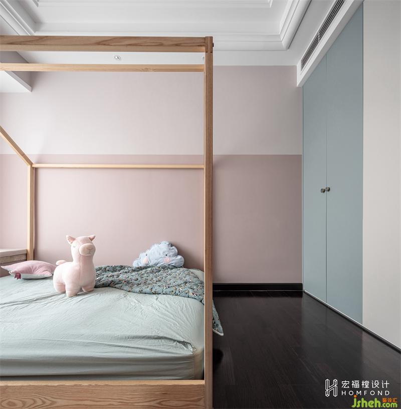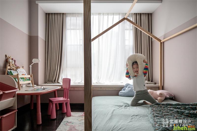 我們在兒童房的構(gòu)思上花費了很多心思,女兒今年三歲,一個可變性較強且同時富有趣味的空間對她的成長非常重要。首先我們將墻面做了分色處理,裸粉碰撞蜜桃色,優(yōu)美動人又集少女氣質(zhì)的可愛單純與嬌嫩細(xì)膩。再搭配可愛造型的木屋床,仿佛整個世界都能被這份美滿包圍。