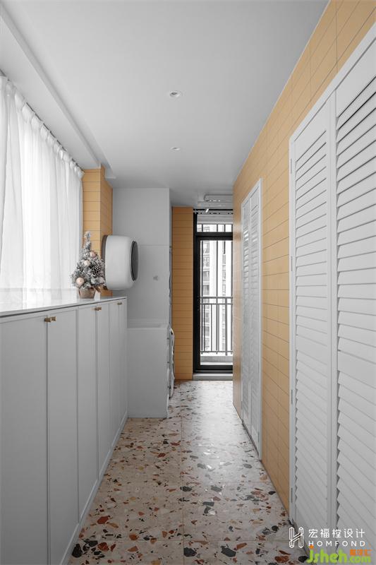家居設(shè)計將生活陽臺徹底的利用起來,劃分為兩個區(qū)域,儲物+陽臺。左側(cè)靠窗位置設(shè)計3530mmx600mm的柜子,放置生活雜物,右側(cè)則隔成了女兒的衣帽間+大件雜物間。因為空間非常明亮通透,配以白色乳膠漆混搭赭黃色瓷磚,陽光透過紗簾映照在百葉窗上時,愜意的氛圍撩撥著身心與視感。