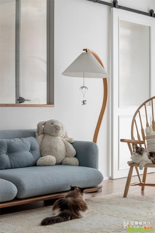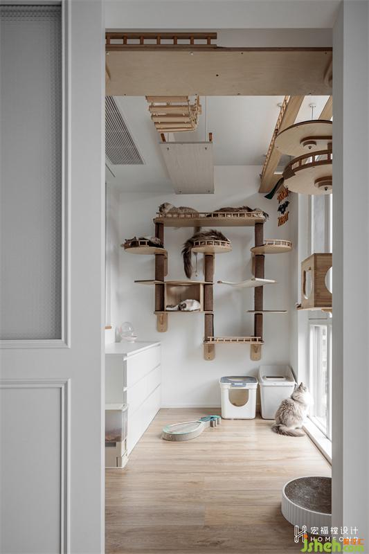 書(shū)房與原始生活陽(yáng)臺(tái)合并后重新劃分面積,將6m2空間改造為貓舍。貓架是女主人花了好多心思挑選的,高低錯(cuò)落,同時(shí)擁有眺望區(qū)、休息區(qū)、攀爬區(qū),玩耍區(qū),這里,對(duì)九只貓咪來(lái)說(shuō)充滿(mǎn)了愛(ài)與無(wú)限樂(lè)趣。