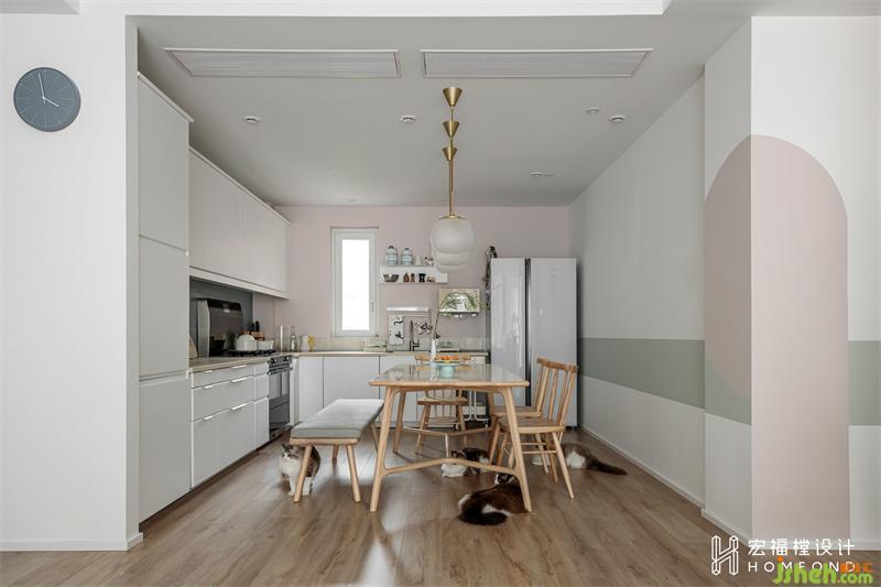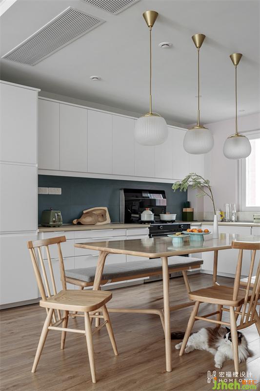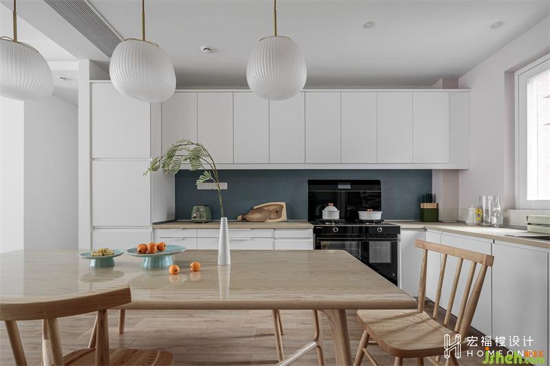 家居設(shè)計(jì)整合原始局促的餐廚區(qū)域,改造為L(zhǎng)DK開(kāi)放式。區(qū)別于客廳,加入更多清爽的色彩,提升層次感與浪漫的氛圍。男主人喜歡做飯,看重與家人、朋友一起用餐的時(shí)間,并把這看作是情感交流中比較重要的一部分。所以選擇多人長(zhǎng)方形餐桌,在具有圍合感的氛圍,很容易想象許多笑臉聚集于此的情景。