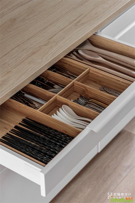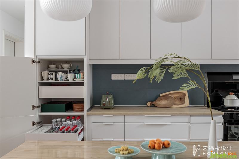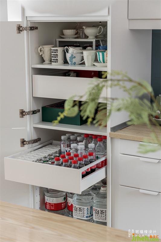 女主人則更注重收納,餐廚空間的儲(chǔ)物柜是她根據(jù)與先生的生活習(xí)慣,然后查閱了許多資料,多次去宜家學(xué)習(xí)測(cè)量后規(guī)劃定制的。
