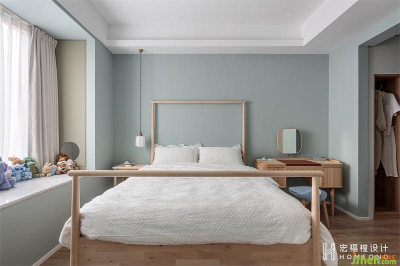 原始主臥本無(wú)獨(dú)立衣帽間,我們將其臨近次臥合并,改變門(mén)洞位置,合并為多功能一體的舒適大套房。女主人偏愛(ài)冷色調(diào)中的藍(lán)綠系,所以空間墻面運(yùn)用了豆蔻青,引入戶(hù)外的閑適氣息。簡(jiǎn)潔的設(shè)計(jì)中,靜心愜意,同時(shí)也能感受到木質(zhì)材料傳遞的溫度。