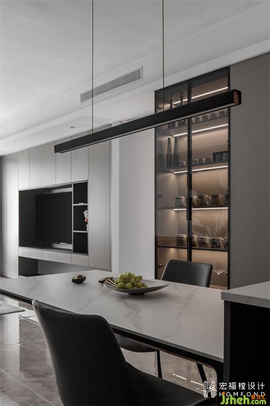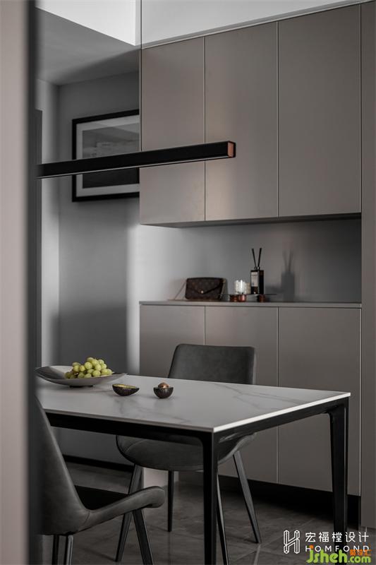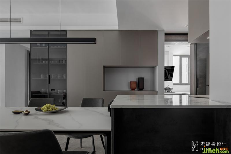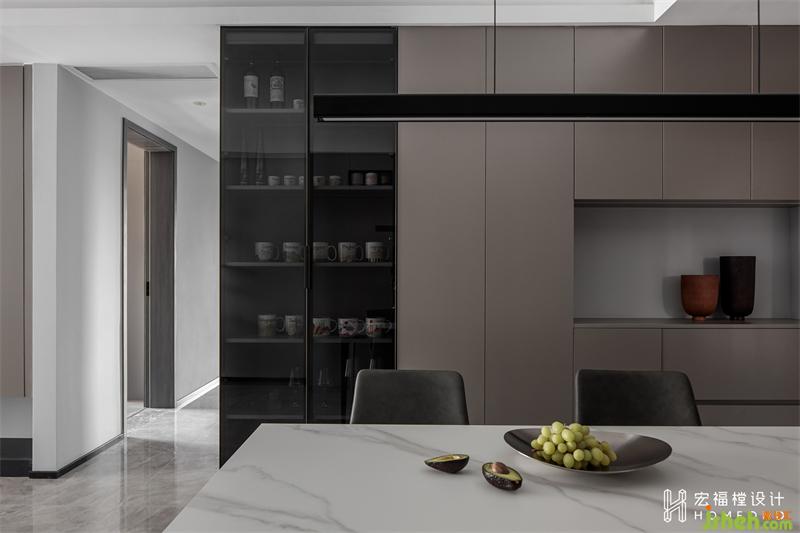 家居設(shè)計利用中廚延伸出來的350mm設(shè)計餐廳區(qū)域柜體,深色玻璃展示區(qū)+餐廚雜物儲物區(qū)。屋主兩人常年都會去各地旅游,并熱衷于收集當?shù)氐鸟R克杯,整個展示柜承載的是他們滿滿的美好回憶和走遍世界的收獲。