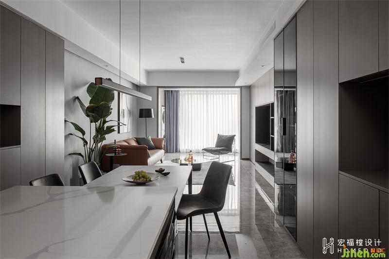 全屋以黑白灰進行潤色后融入大地色系,提升平和優(yōu)雅感的同時減少空間的冷度。簡潔的裝飾、充滿新鮮氣息的大理石達成了一種自然的平靜。在陽臺區(qū)域納入客廳、原始廚房墻體拆除后,南北通透,自然光線透過玻璃散發(fā)充足。