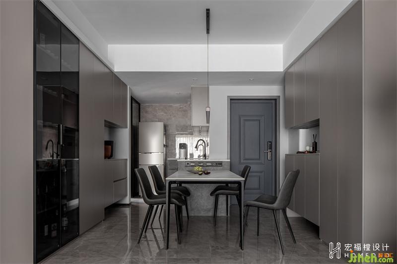 原本餐廳面積較小,加上玄關(guān)鞋柜2130mmx350mm位置,空間更為吃緊。所以將原始廚房墻體進行拆除,并合并臨近的生活陽臺空間,劃分為中西廚兩部分。開放式西廚則與餐廳島臺連為一體,既減少了使用面積,也完全符合屋主較西式的用餐習慣。