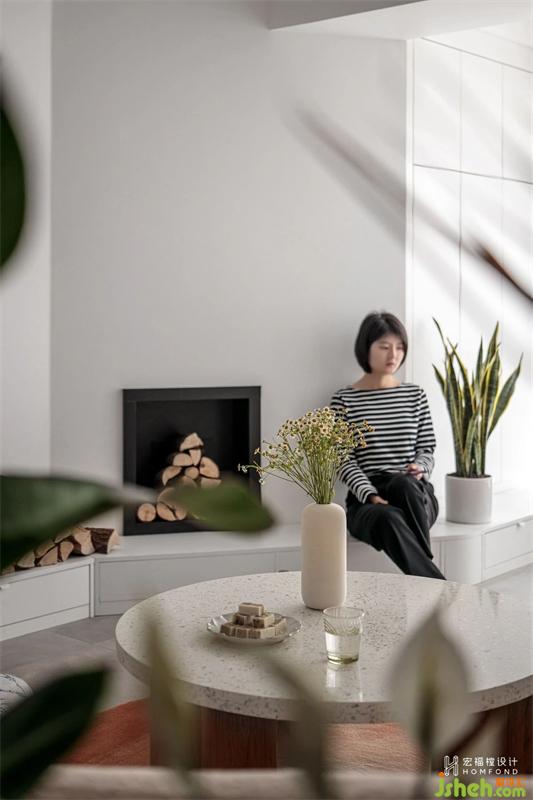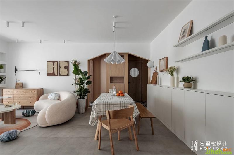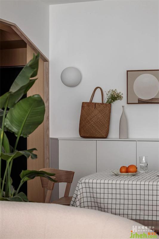 在滿足兩間臥室的實用和隱私性之后,打破客餐廳常態(tài)布局,呈現(xiàn)出靈活別致的有趣動線。以白鷺色為空間整體基調(diào),室內(nèi)材質(zhì)使用擁有溫潤屬性的天然木材、棉麻織物,適當加入綠植,讓居住者在細膩而樸素的色系中,找尋到日常生活里最舒適、愜意的狀態(tài)。