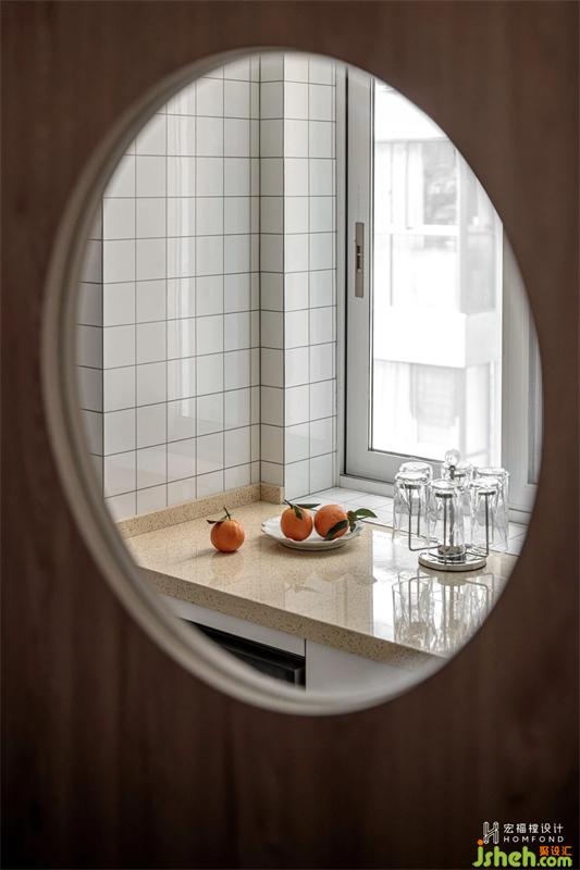 玄關(guān)與廚房空間互相交互使用功能,因入戶區(qū)域無自然采光,我們將改造引至廚房門局部的材質(zhì)替換上,利用玻璃飾面,將廚房通透的自然光線引入玄關(guān)空間。
