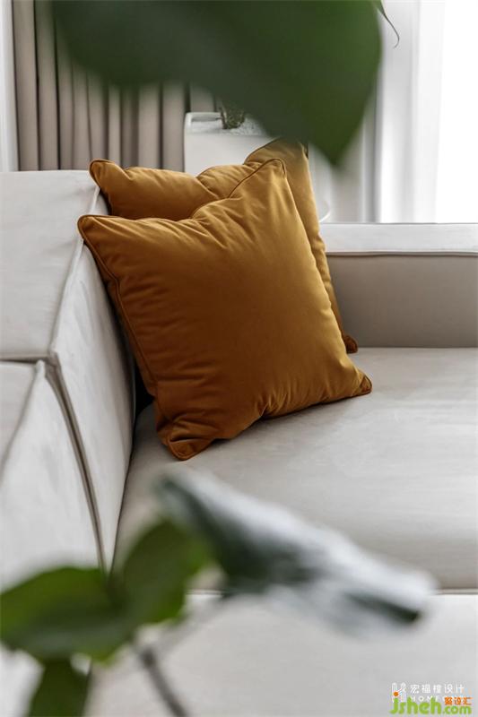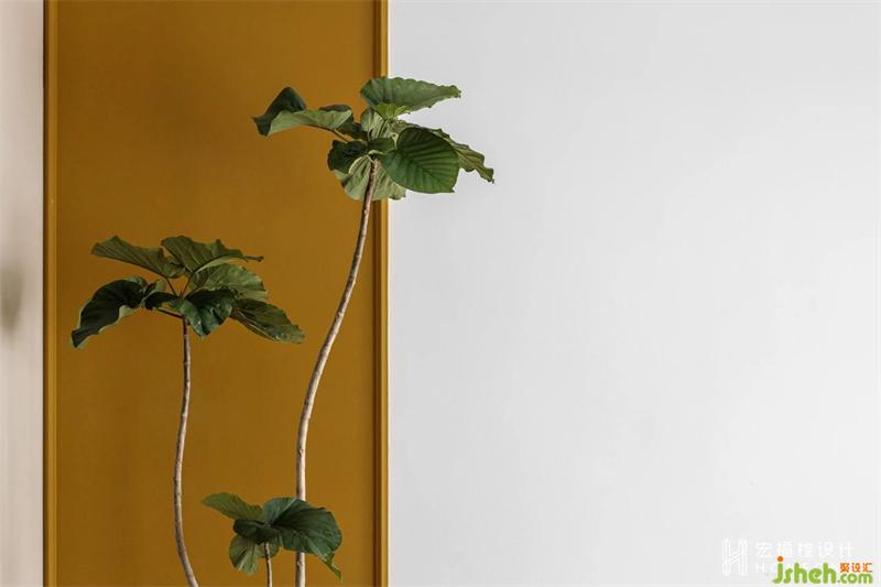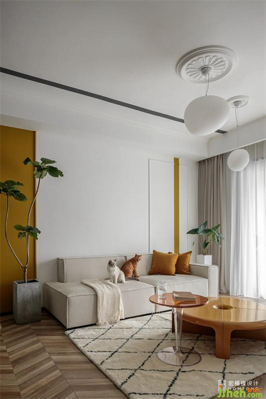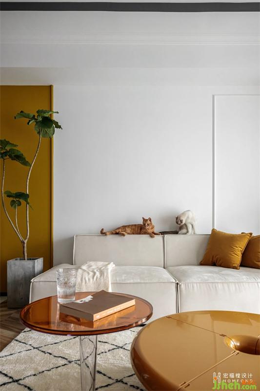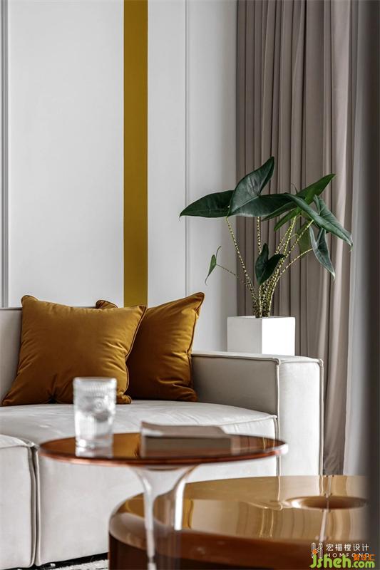 左框以分割設(shè)計手法來強調(diào)墻面存在感,右框以傳統(tǒng)歐式石膏線作為分割,再以線作為串聯(lián)。芥末黃作為背景色進(jìn)行填充,沙發(fā)、邊幾則無需過多的裝飾便可以達(dá)到高級而藝術(shù)的效果。燒橙色亞克力咖啡桌的加入,客廳空間獲得了完美的對比度。