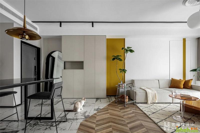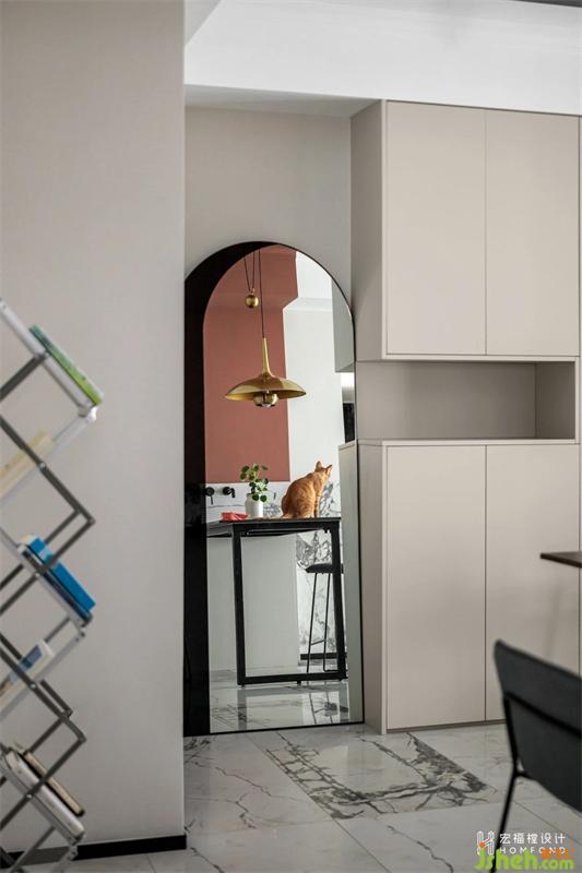 入戶加入1600*350mm收納柜,同嚴(yán)肅神秘的黑框鏡面與暖灰柜面碰撞,產(chǎn)生一系列的情感反差。地面進(jìn)行斜面分割,異形魚骨拼木紋磚交錯寒江雪大理石地磚,張弛有度,彰顯活力個性的同時讓整體空間更富有藝術(shù)感。