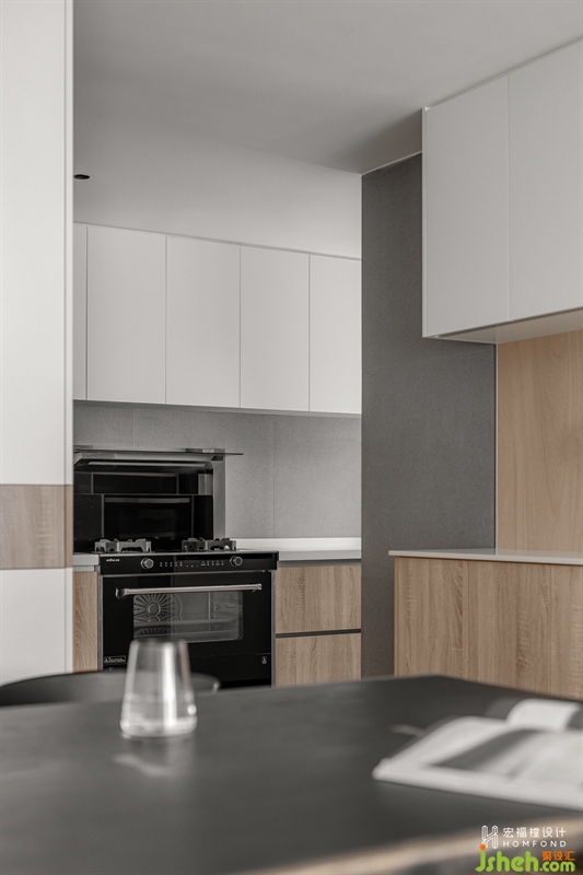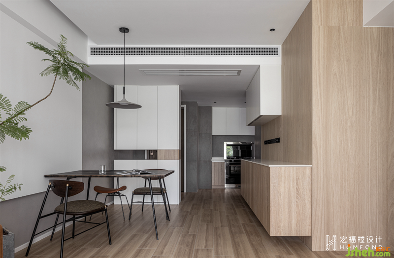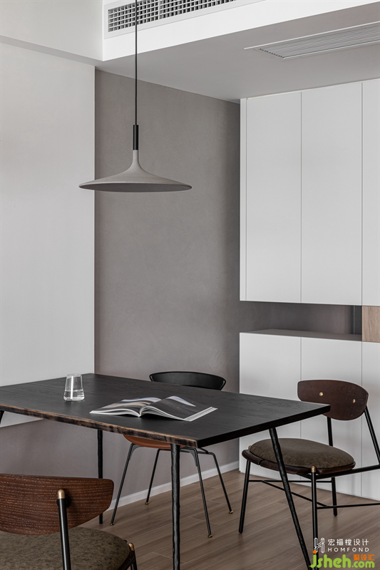 延伸至餐廳墻面的灰色藝術(shù)涂料與客廳的白色墻體交匯,營造出隨性自在的氛圍感。它與玄關(guān)、中西廚以一種近乎有序的方式鏈接了起來,而橡木自然邊餐桌,點綴了秩序之中的靈動力。