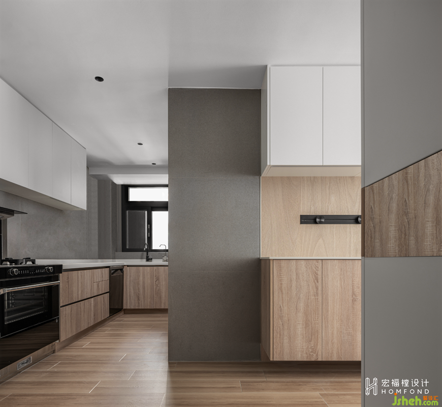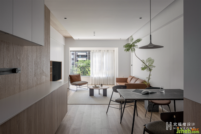 走廊舍棄多余的裝飾,家居設(shè)計通過材料、形式、光線的均衡融合營造出舒心的平靜力。