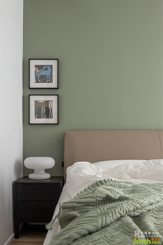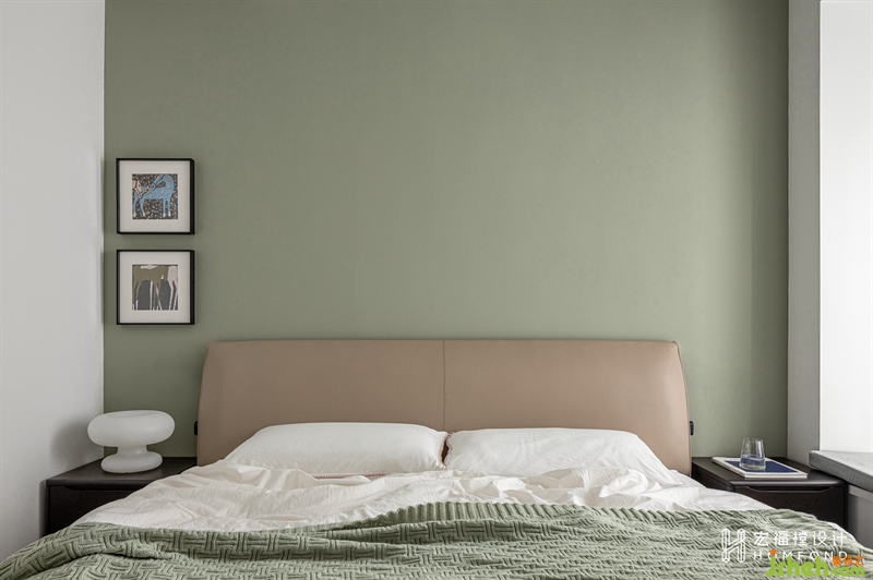 強調(diào)寧靜自在的舒緩感受力,主臥大面積使用了灰綠色作為空間主調(diào),并與奶油色混合搭配,提升空間格調(diào)外,又帶有一絲生機與從容感。