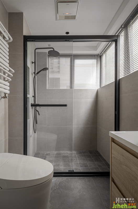 選擇磨砂質(zhì)感的沙色瓷磚,沉浸舒緩的力量,恰到好處的賦予空間足夠的溫度。日光透過90度玻璃窗進入室內(nèi),與自然產(chǎn)生鏈接,明亮通透。