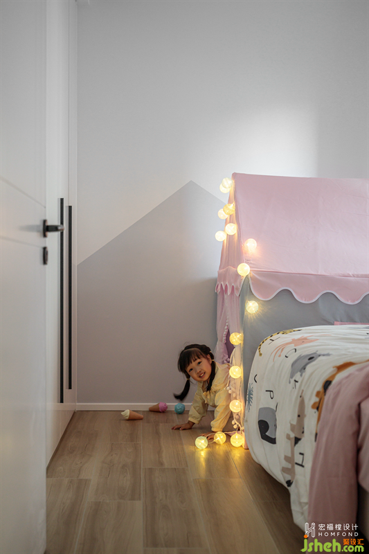 調(diào)整兒童房墻體關(guān)系,讓空間足夠?qū)挸?。童年是擁有無限想象力的時候,所以將她的喜好和個性作為設(shè)計前提,加入可愛造型的分色墻以及粉色系戶外小帳篷,讓空間氛圍變得活潑有趣。