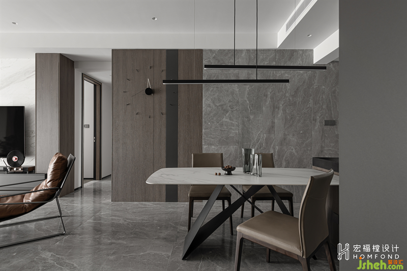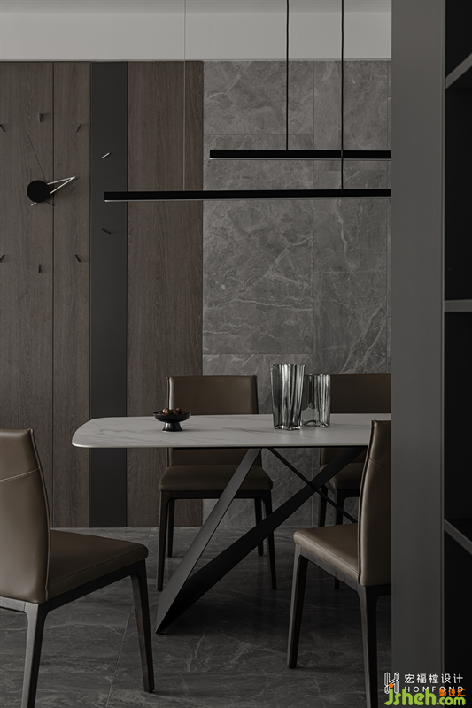 客餐廳與懸掛位于同一空間,給人通透的視覺感受,保證空間的整體和諧。裝修設(shè)計大理石紋路和木制結(jié)合,相近的色調(diào)帶來輕松舒適感。