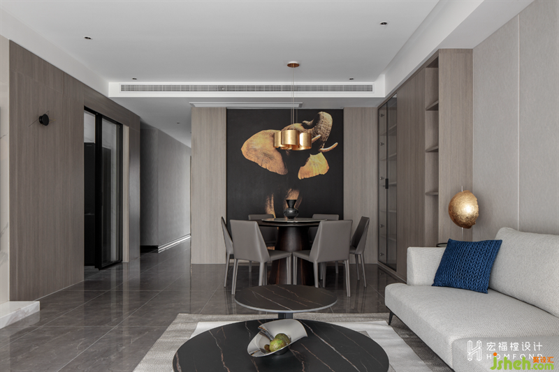 餐桌以聚合的圓形呈現(xiàn),家人們圍合而坐,沒有棱角,寓意一家人齊齊整整般和睦。充分利用可展示墻面,選擇大膽的大象造型墻紙,形成戲劇張力。以獨(dú)特的美學(xué)視角,奇妙的感官之旅為空間注入與大自然共生的天然關(guān)系。