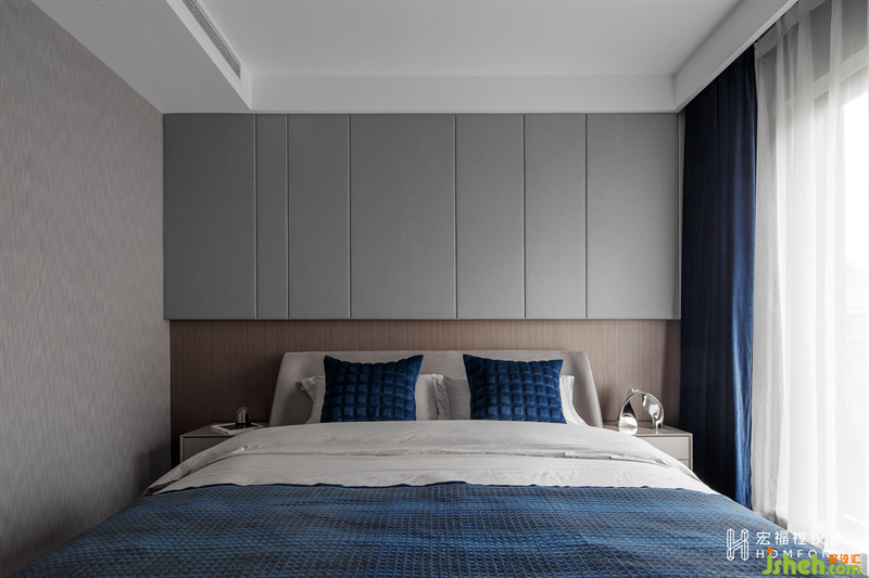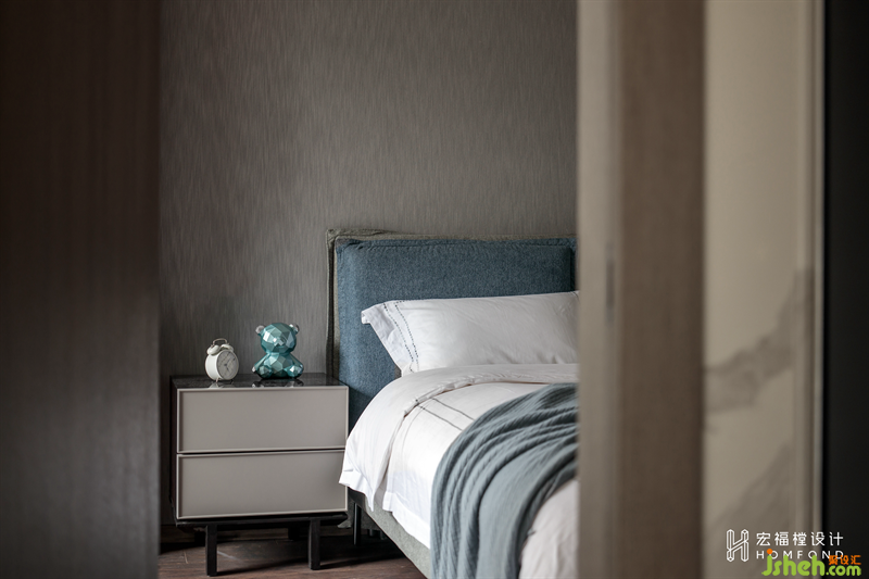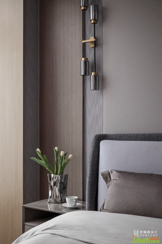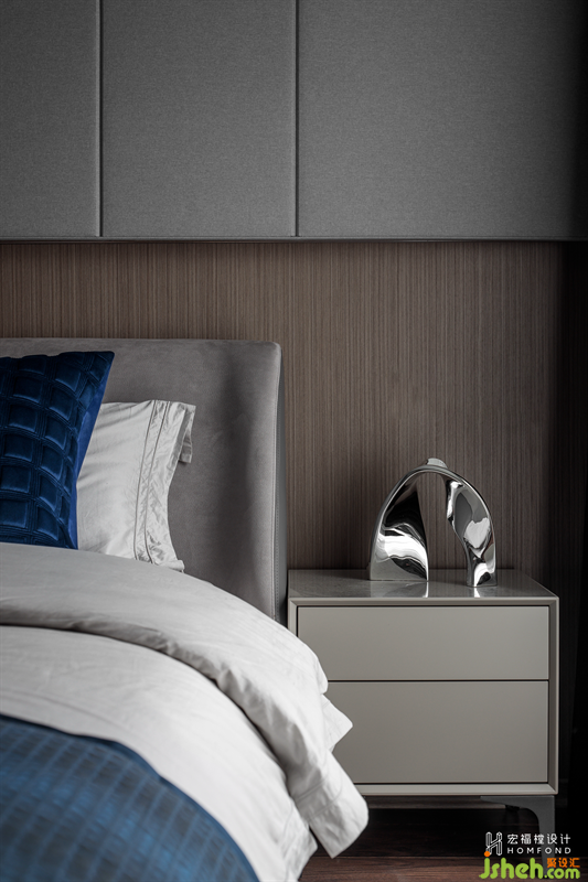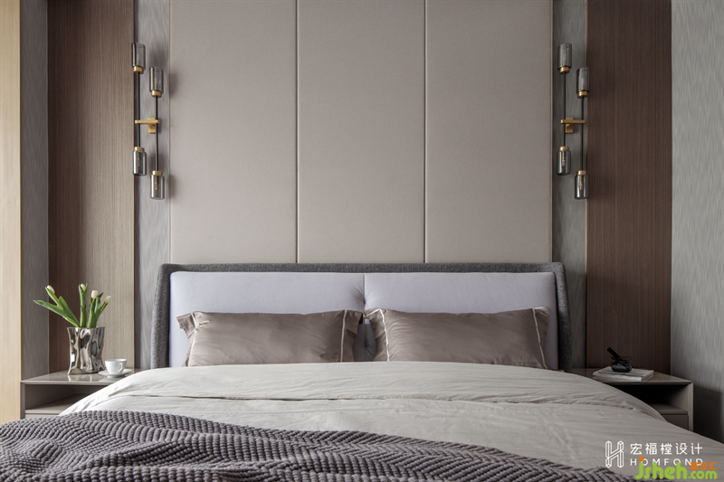 夫妻工作較忙,對于睡眠區(qū)域更注重寧靜及舒適。延續(xù)客廳的硬包造型,以柔和沉浸的煙灰為主色調(diào),提供舒緩的撫慰作用。并加入天然木飾面,為空間注入鎮(zhèn)定和恢復(fù)的力量源泉。