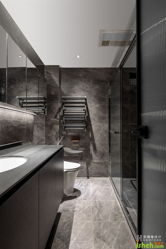 與公共空間相比,較為私人的主臥衛(wèi)生間氛圍變得更沉穩(wěn)大氣,讓空間演繹出男屋主為一家人付出的的剛毅和堅定。