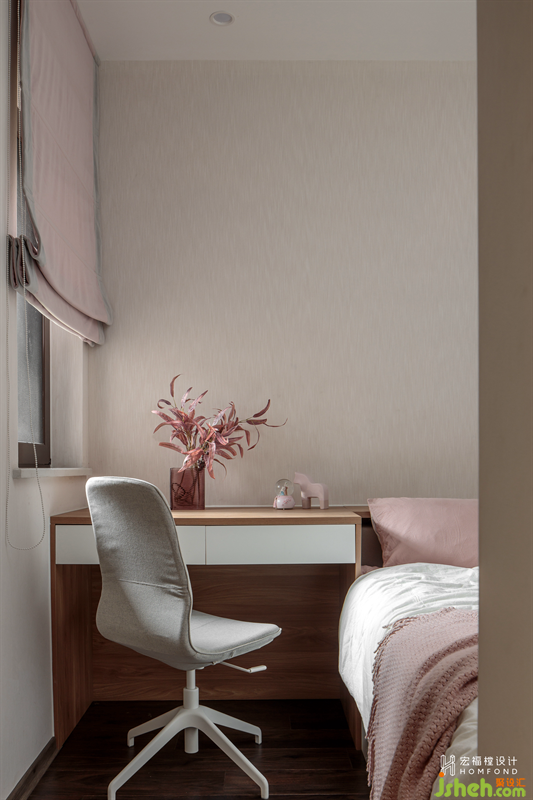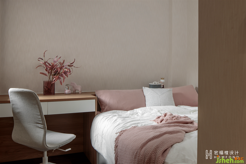 兒子的房間是利用原始餐廳與部分陽臺合并而來,從電視墻左側(cè)進(jìn)入,隱形于墻內(nèi)。因有足夠的面積使用,所以空間除了睡眠區(qū),也加入了學(xué)習(xí)空間。