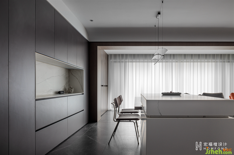 煙灰色石材大面積鋪貼為空間注入安穩(wěn)的氣氛,利用百葉窗將陽光進行過濾,空間在與自然融合過后顯得更輕盈氤氳,讓使用者擁有對生活更細致的體察。