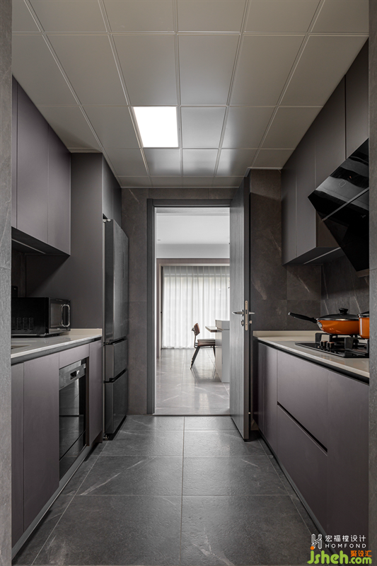 空間的連通性,讓不同的功能區(qū)域在視覺上形成串聯(lián)與穿透,餐廳的柔和韻律為廚房形成一處視角端景。2110mmx2210mm左右長柜為居所帶來足夠的儲物空間,與原始儲物陽臺合并后的廚房擁有由外界引入的豐沛光線。