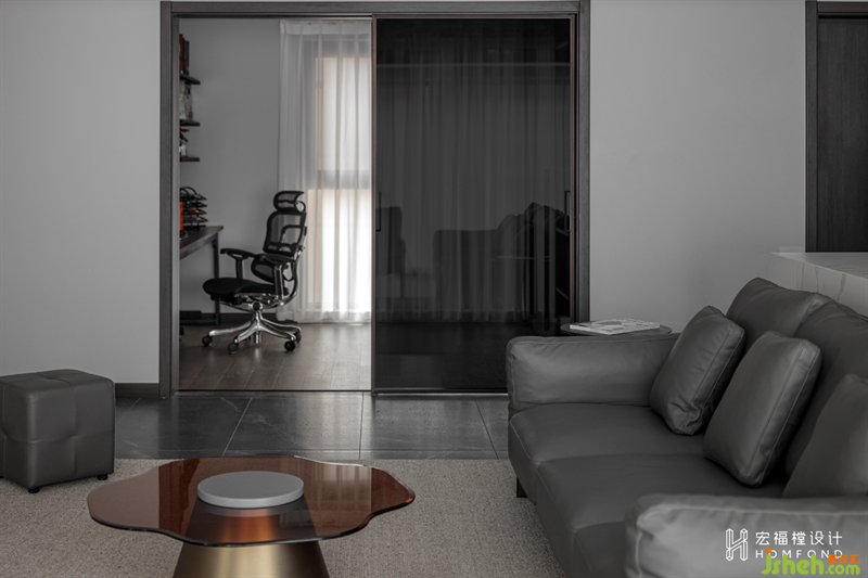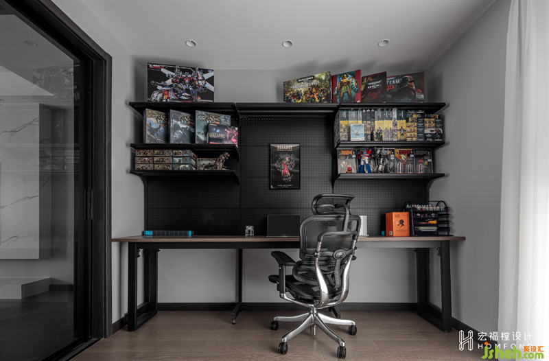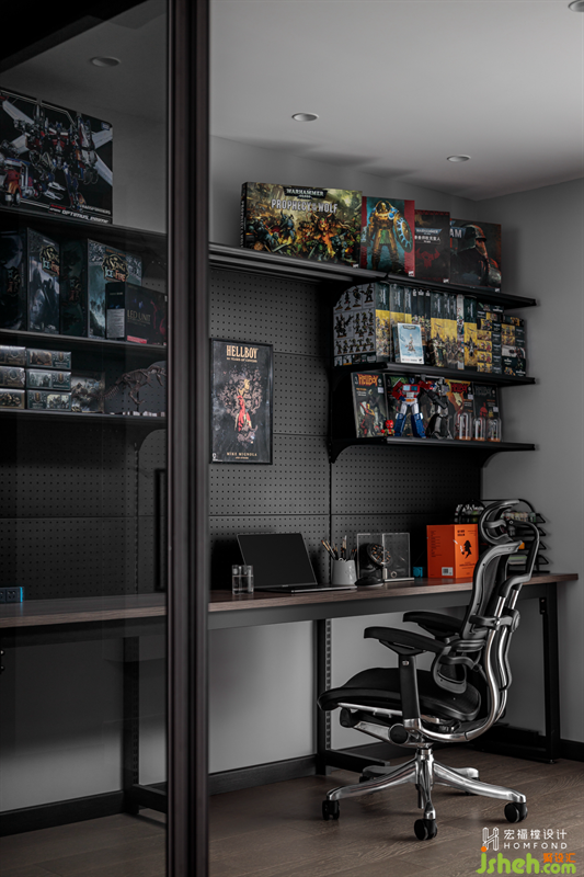 多功能房是居所中很重要的一處區(qū)域,用黑色玻璃統(tǒng)一與公共空間的色調(diào)。推拉式移門可讓書房同時擁有私密與開放兩種功能。內(nèi)部定制掛墻展示架以及儲藏手辦玻璃柜,讓屋主在工作以及制作手辦時,能夠有很好的沉浸式體驗。