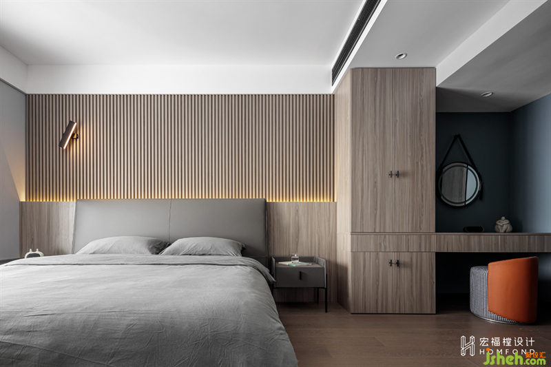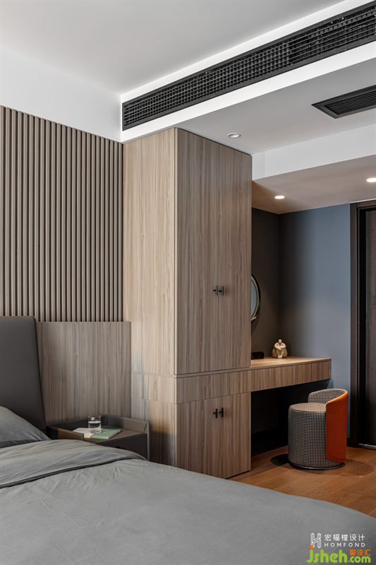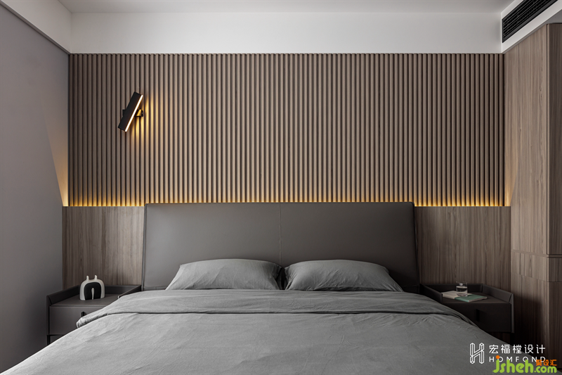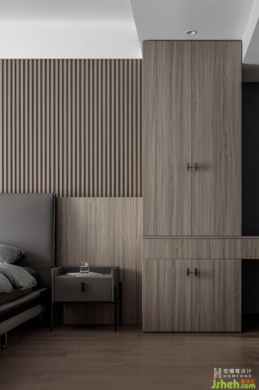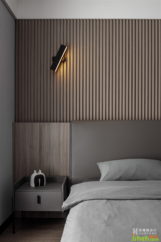 背景以溫潤的木頭材質(zhì)進行呈現(xiàn),格柵的肌理與燈光賦予的流動感,創(chuàng)造出豐富的視覺感官。霜灰色床品與墻面搭配出自然的層次感,而延伸的柜體在有形與無形之間達到了隱形效果,讓空間看起來更加潔凈有序。