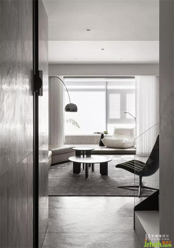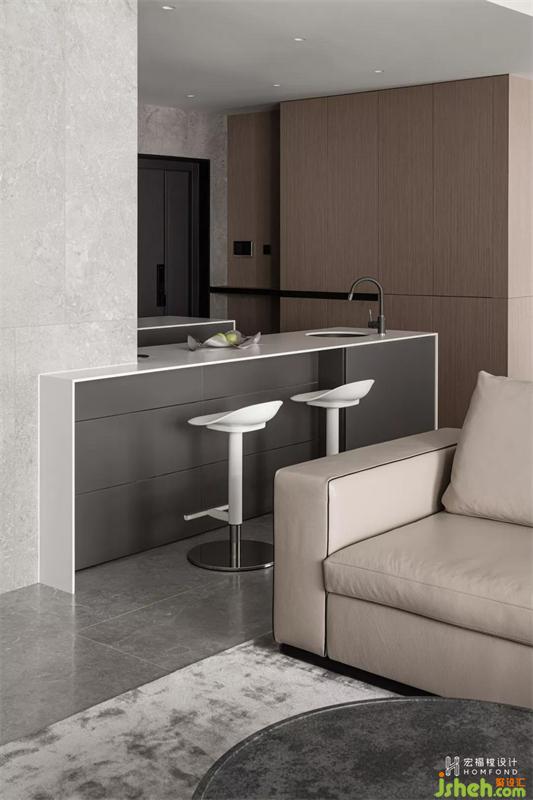 環(huán)顧四周,活動空間由不同形狀的極簡單體組成(banlan沙發(fā)、茶幾,coconordic fred沙發(fā)椅、togo單人沙發(fā))分出區(qū)域與高度層次。重視觸感與質(zhì)感,利用更經(jīng)久耐用的巖板、皮革、大理石來替代浮華的裝飾,形成連續(xù)的、有機(jī)的空間系統(tǒng)。