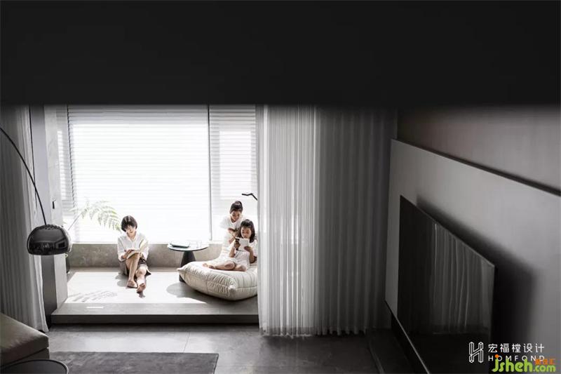 抬高120mm形成地臺,陽光被牽引入內(nèi)。光線在百葉過濾后與空間形成一種動態(tài)且安靜的交流,墻面與地面之上的光影被加強、模糊以及擴(kuò)展,逐漸弱化了空間的重量。