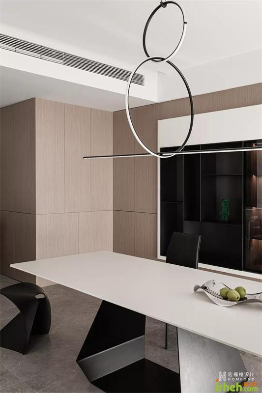 木飾材質(zhì)貫穿玄關(guān)與餐廳空間,作為視覺延伸,形成整體的框架結(jié)構(gòu)。寬闊但體態(tài)輕盈的Bonaldo Amond餐桌、趣味橫生的Flos Arrangements餐燈、可塑性極強的table chair,注重體現(xiàn)多元化又獨立的風(fēng)格,將生活品質(zhì)向上發(fā)展。