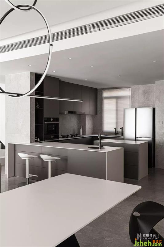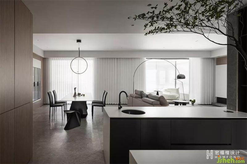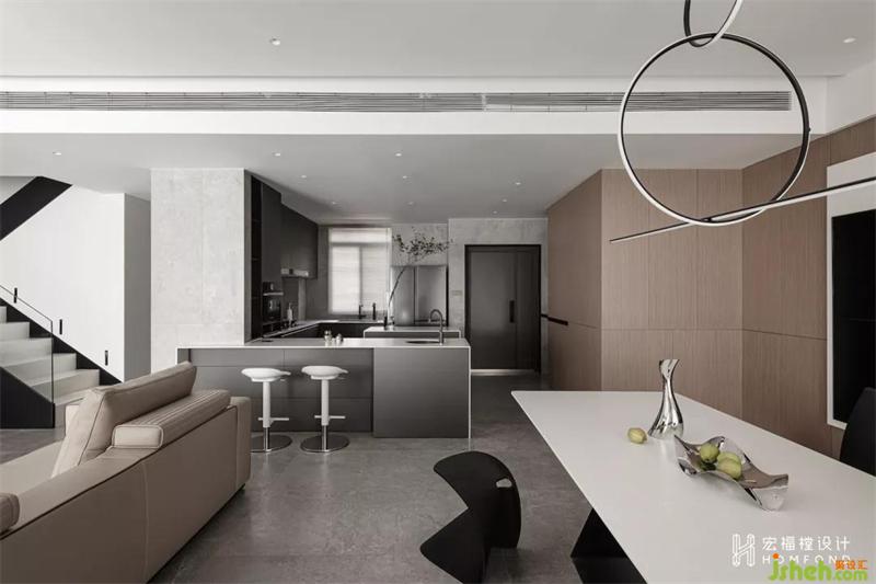 空間前后形成多種虛實關(guān)系,利用凸顯與隱后的設(shè)計手法將餐廳展示柜以懸空的視覺方式呈現(xiàn),給人以輕盈之感。開放后的廚房與餐廳動線,讓平日的生活互動變得更生動。