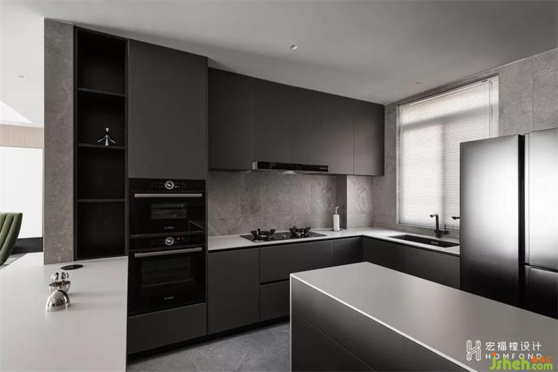 空間中互相呼應(yīng)的材質(zhì)讓不同體塊的廚房柜體變得不再呆板,并帶來準確的秩序。當它們貫穿于使用之中時,便會充分展現(xiàn)出設(shè)計師給予它們的生活形態(tài)。這樣多功能的居住空間也為居住者提供一個適宜的私人聚會、休閑場所。