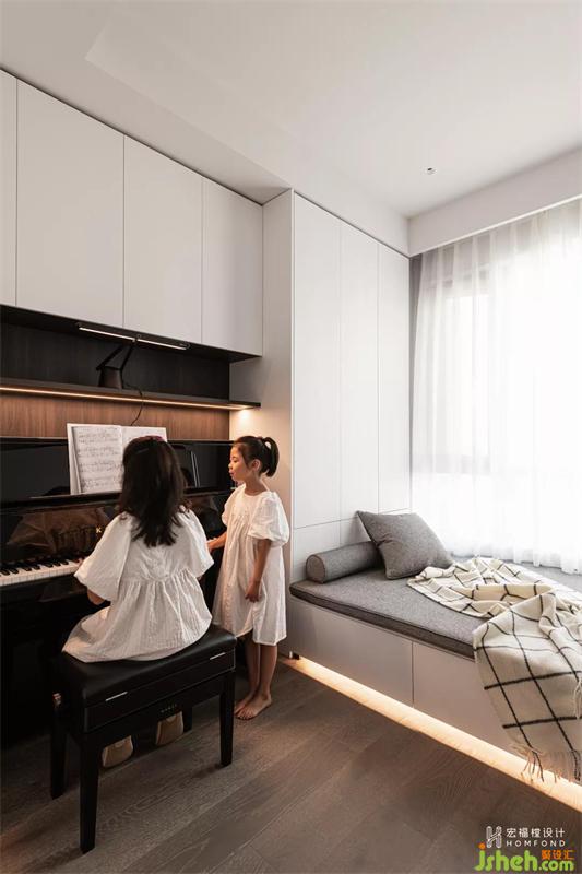 女兒們的琴房位于樓梯一側(cè)較私密的房間,在學習之余彈奏鋼琴可以為她們創(chuàng)造更優(yōu)雅的音樂世界,接受更多西方古典文化的熏陶。一曲悠揚的曲子有時總能安撫青春期帶來的煩躁與不安,讓心境變得怡然自得。