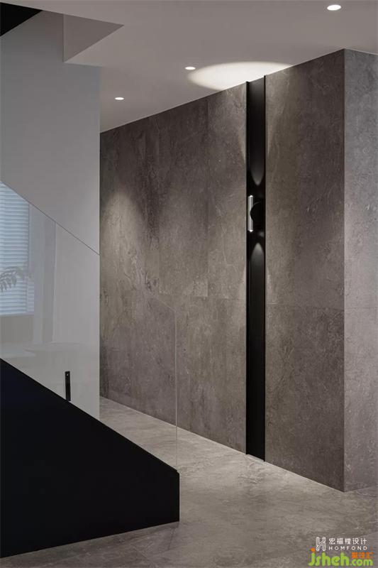 樓梯在反向改造過后,擴大梯間視野,面向公共空間。延伸廚房墻磚材質(zhì)至走廊墻體,去掉過于用力會產(chǎn)生的繁雜效果,打造出更符合屋主的空間感染力。