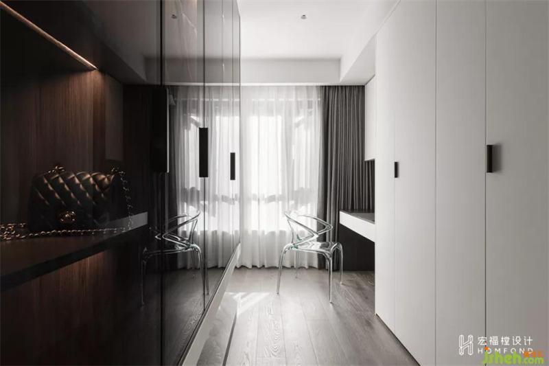 加入更豐富多元的空間體驗以及游走其間的趣味性,通過細致把控墻體的重量,將電視墻體進行懸空。并利用足夠的厚度將另一面設計為儲物展示空間,提升臥室內部的互動及功能性。