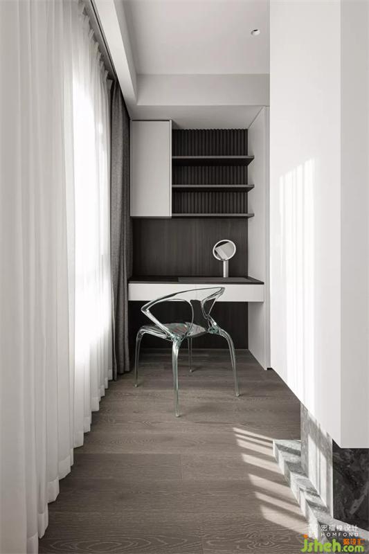 夫妻二人無論是選擇家具或是衣物,統(tǒng)一都會選擇更精簡、經典的款式。對于家的功能思考,開放性與獨立思考也同樣重要,所以為其在6000mm長的落地窗帶來的豐沛光線下,加入一處靈活辦公區(qū)域。