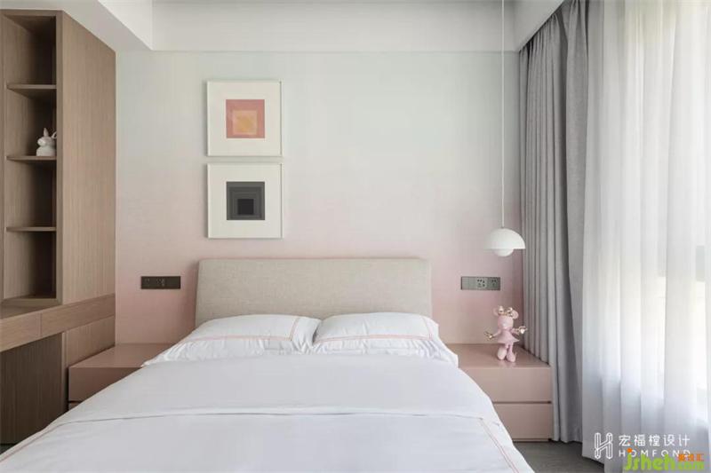 粉色依然作為另一間兒童房的基礎色,柔性氣質得以蔓延。取消臥室原本附帶的衛(wèi)生間,擴大面積,滿足起居與學習功能,漸變的浪漫墻畫,氣氛輕盈通透,創(chuàng)造出超脫現(xiàn)實之外的夢幻與臆想。